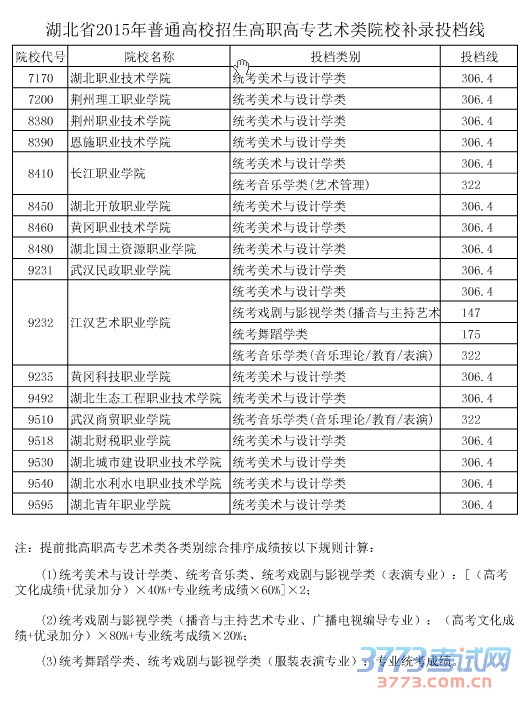 [图文]2015湖北高考高职高专艺术类院校补录投档线