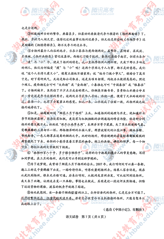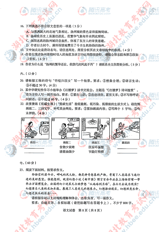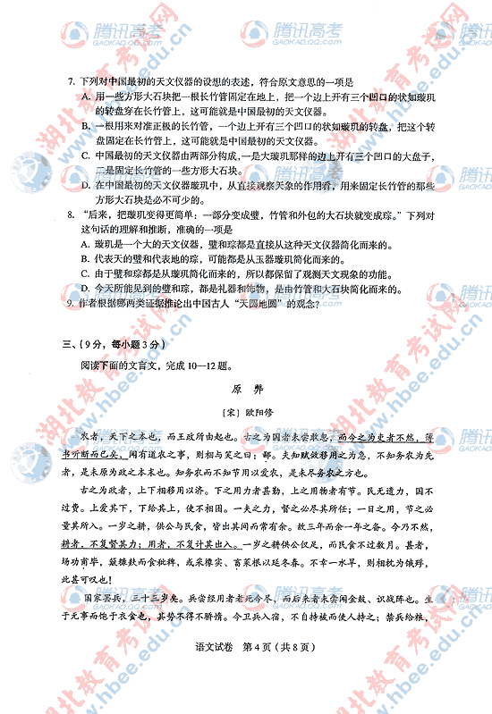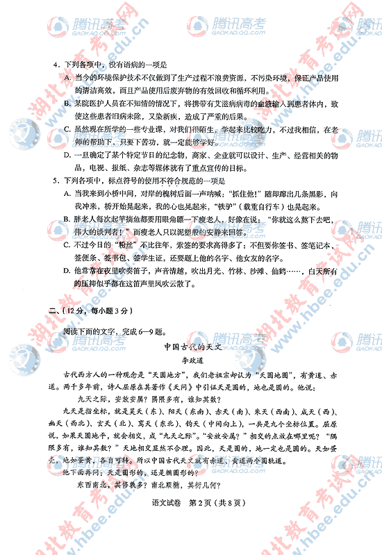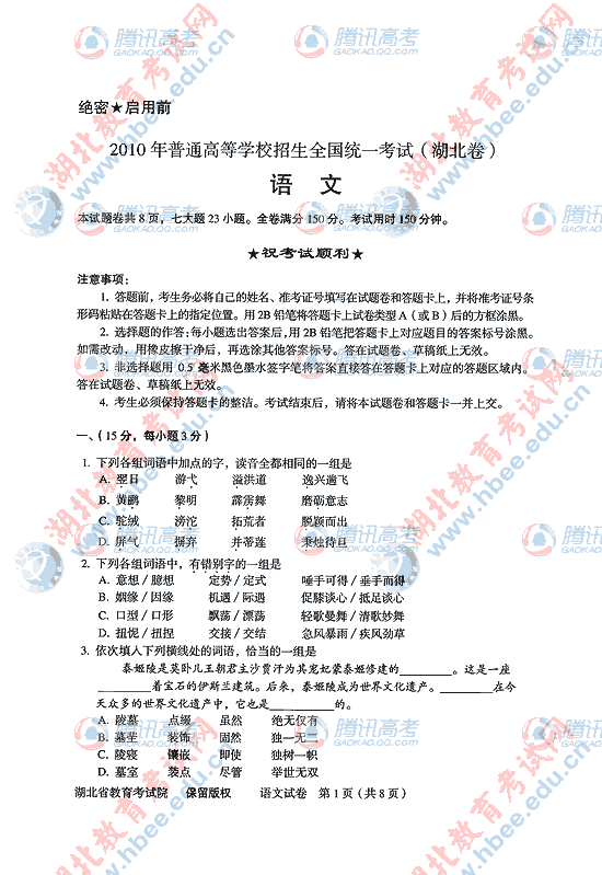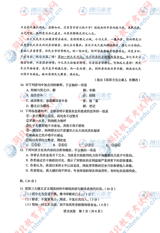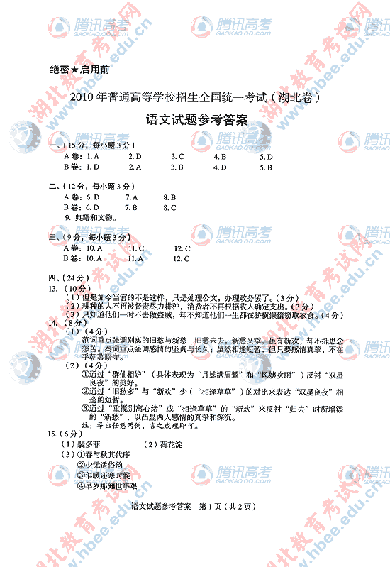 2010年湖北高考语文试题及答案