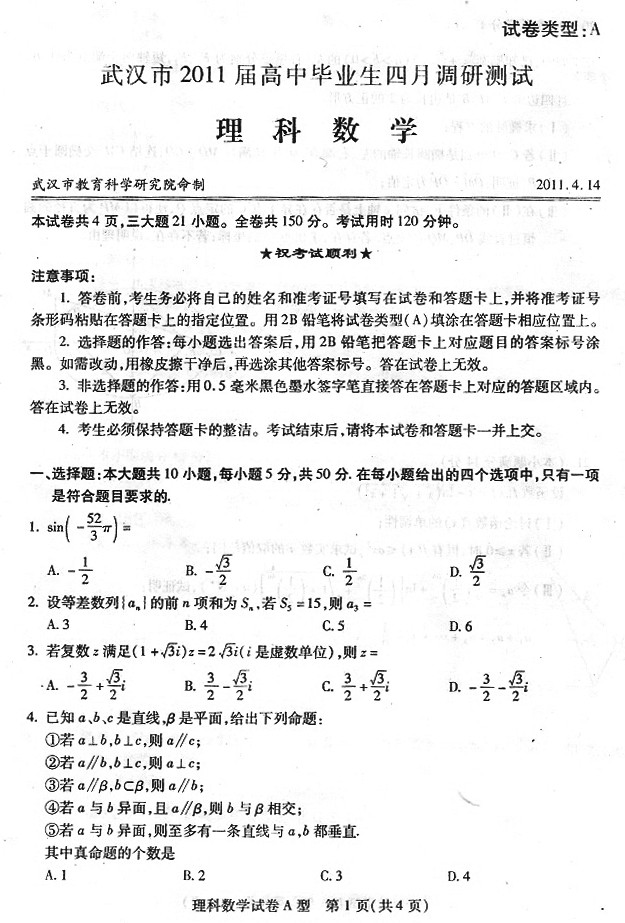 [组图]2011湖北武汉四月调考理科数学试题及答案(A卷)