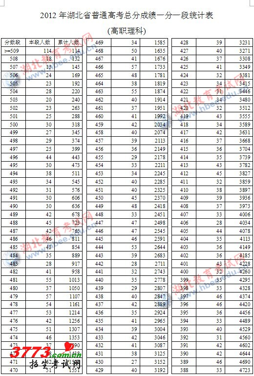 [组图]2012年湖北省高考一分一段统计表(高职理科)