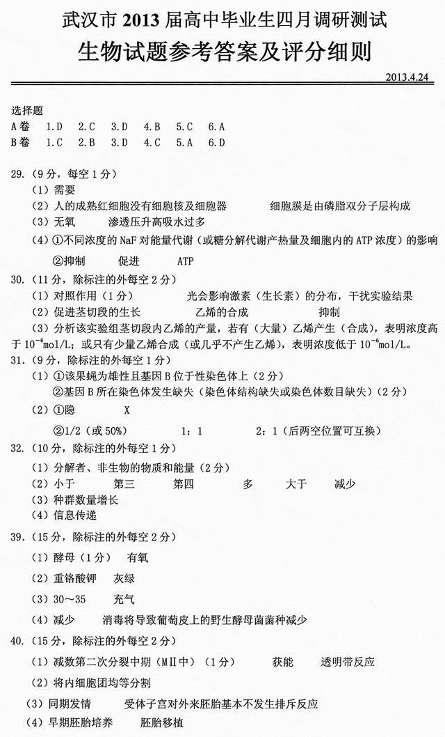 市2013届高中毕业生四月调研测试生物试题参考答案及评分细则
