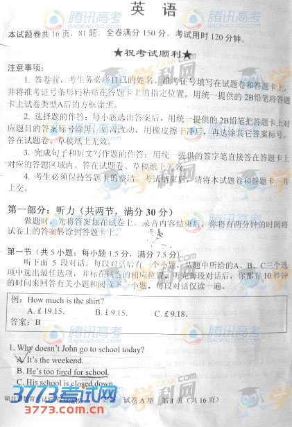 [组图]2013湖北高考英语A卷试题及答案参考