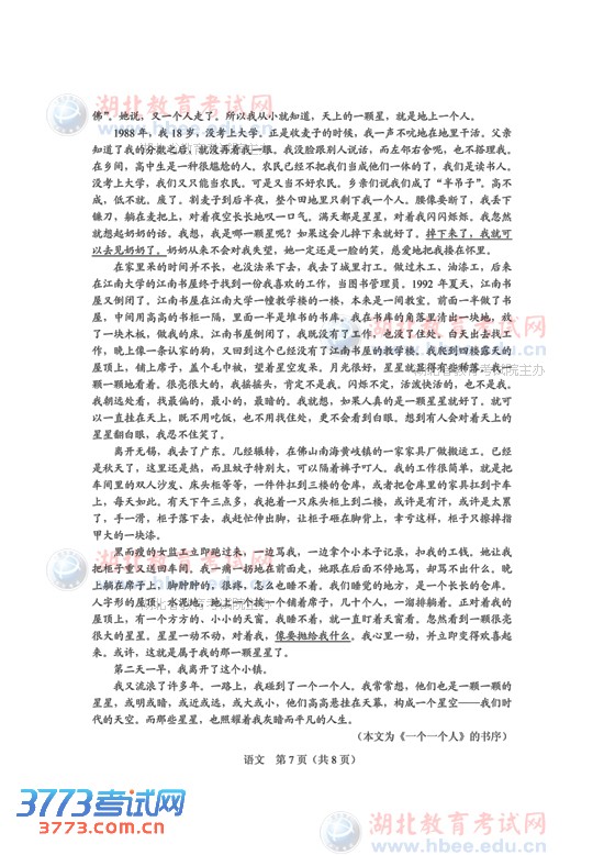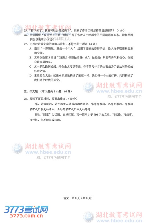 3773考试网2016高考湖北高考正文