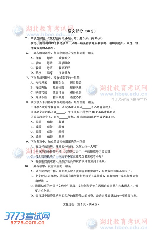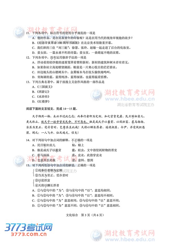 3773考试网2016高考湖北高考正文