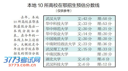 去年,本地10所高校在鄂录取最低分高出一本线分数(即今年的一本分数线加上下面的分数,就是该校预估分数线)如下表,在今年的一本线上加上这些分,大概就是今年这些学校在鄂招生的预估分数线了。
