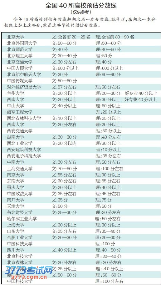 今年40所高校预估分数线超湖北省一本分数线,就是说,在湖北一本分数线上加上这些分,就是这些学校的预估分数线。