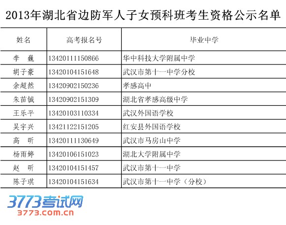 [图文]2013年湖北高考边防军人子女预科班考生名单公示