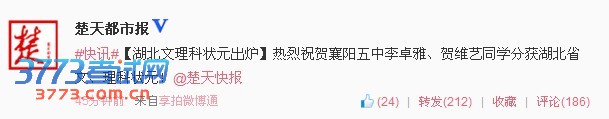 荆楚网消息(记者 刘郸)2013年湖北省高考成绩将于今日(6月23日)发布。据网民爆料,襄阳五中官网发布了一则庆祝消息:该校李卓雅、贺维艺同学分别获得湖北文理科状元。