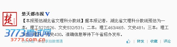 (楚天都市报)【本报预估湖北省文理科分数线】据本报记者,湖北省文理科分数线预估为一本:理工527/526、文史532/531;二本:理工463/465、文史481;三本:理工360、理科、文史430。准确信息等待下午省招办发布。