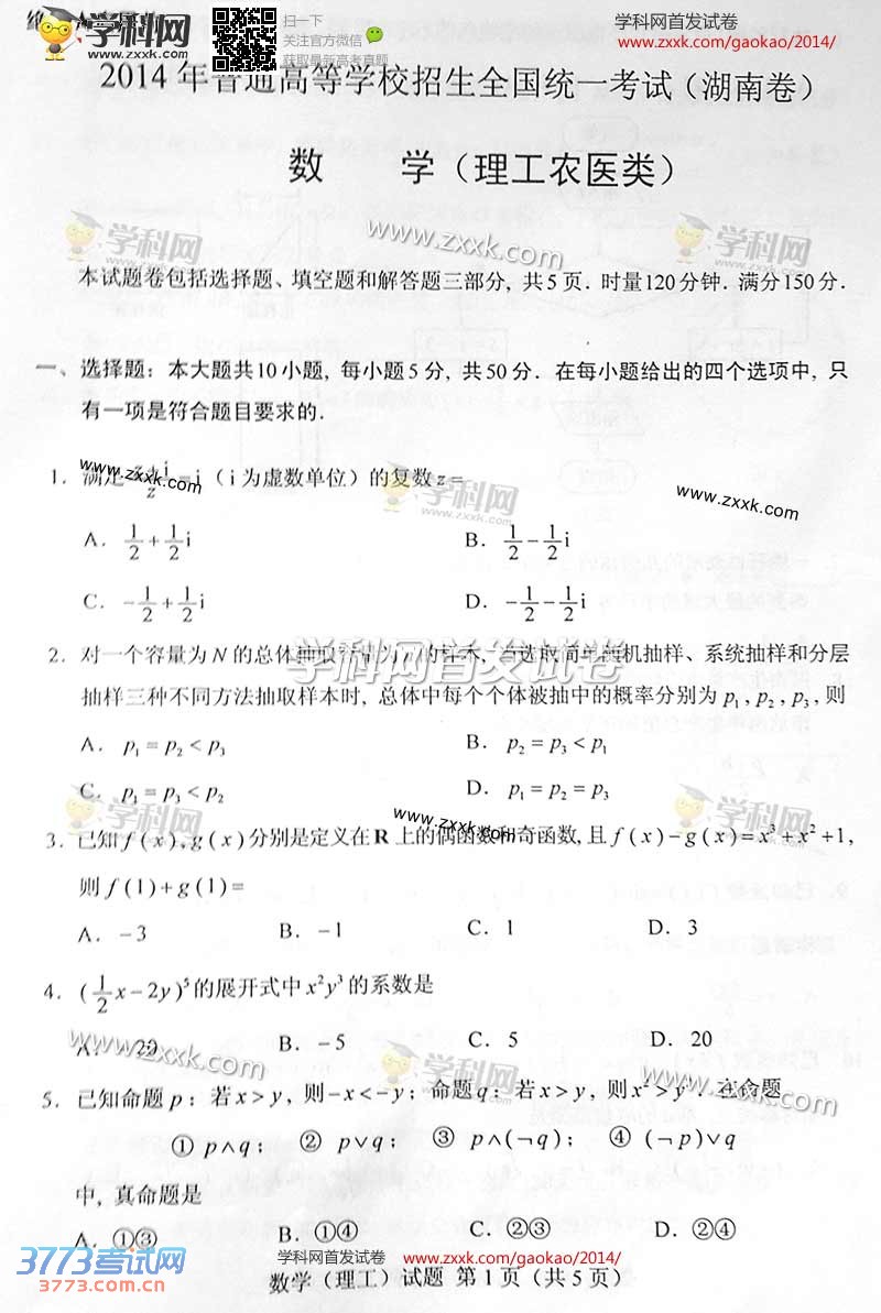 [组图]2014湖南高考理科数学试题卷发布