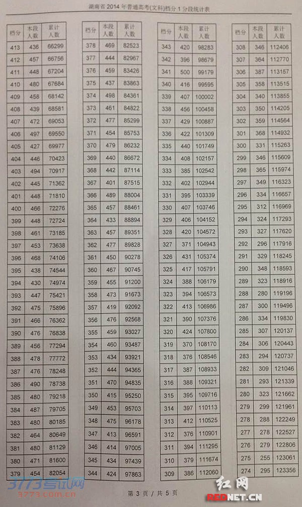 [组图]2014湖南高考分数段一分一段统计表(文科)