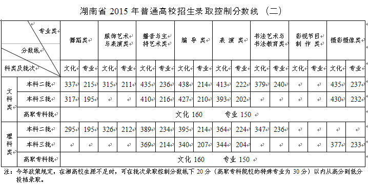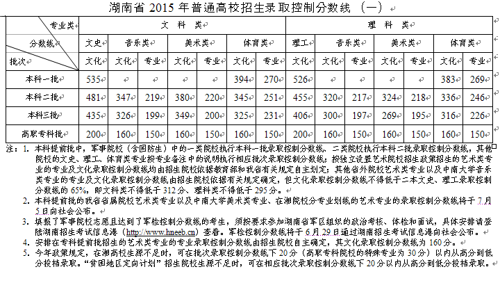 湖南省2015年普通高校职高对口招生录取控制分数线