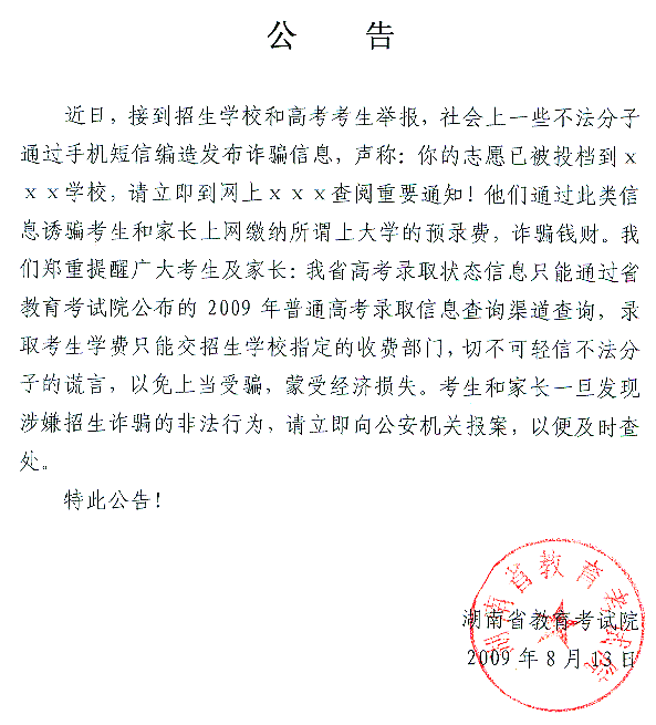 [组图]湖南省教育考试院关于手机短信诈骗的公告