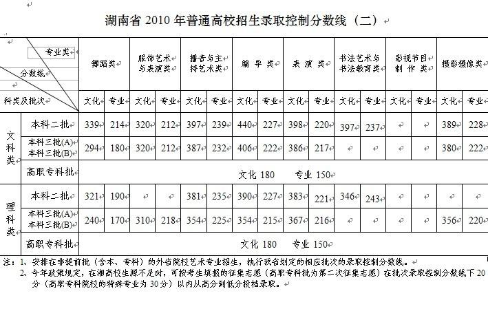 注:1、在本科提前批中,军事院校(含国防生)中的一类院校执行本科一批录取控制分数线,二类院校执行本科二批录取控制分数线;外省院校艺术专业的专业录取控制分数线由招生学校依据有关规定确定,其文化录取控制分数线为:按独立设置本科艺术院校招生政策招生院校(专业)的文化录取控制分数线由学校自主划定,其他外省院校艺术专业的文化录取控制分数线为:文科类339分、理科类321分;在湘院校音乐类和美术类专业、湖南师范大学分专业划线的艺术专业、南华大学和湘南学院农村订单定向医学生免费培养项目单独招生的录取控制分数线将于7月5日向社会公布。