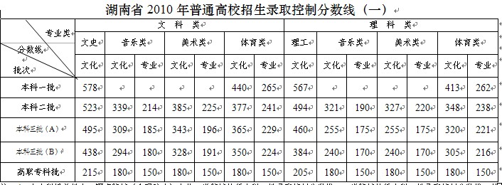 注:1、在本科提前批中,军事院校(含国防生)中的一类院校执行本科一批录取控制分数线,二类院校执行本科二批录取控制分数线;外省院校艺术专业的专业录取控制分数线由招生学校依据有关规定确定,其文化录取控制分数线为:按独立设置本科艺术院校招生政策招生院校(专业)的文化录取控制分数线由学校自主划定,其他外省院校艺术专业的文化录取控制分数线为:文科类339分、理科类321分;在湘院校音乐类和美术类专业、湖南师范大学分专业划线的艺术专业、南华大学和湘南学院农村订单定向医学生免费培养项目单独招生的录取控制分数线将于7月5日向社会公布。
