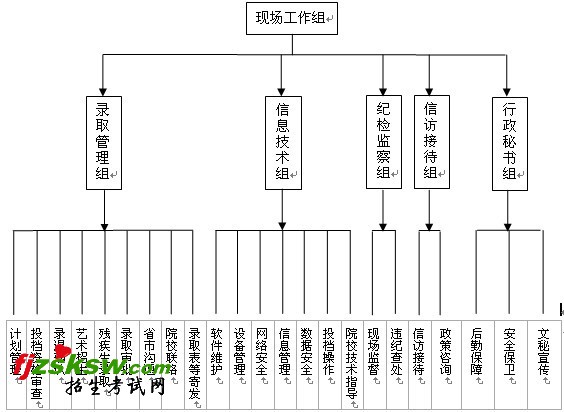 行政秘书组:负责录取场地的安排和安全保卫;为录取工作提供后勤保障;负责协助领导小组做好相关协调工作;负责招生录取宣传工作等。