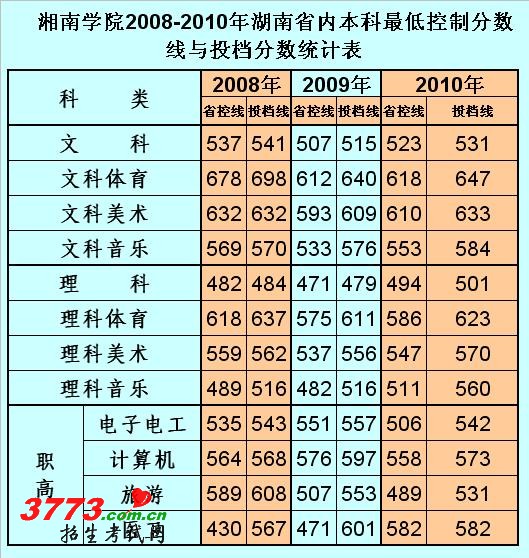 湘南学院2008-2010年湖南省本科录取分数线