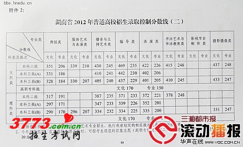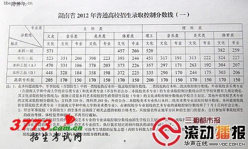 华声在线-三湘都市报讯  湖南省教育考试院今日正式发布今年湖南普通高招录取控制分数线!其中文科一本分数线为571分,二本线523分,三本线A为470分,三本B 为448分,专科一批线205分。理科一本线520分,二本线451分,三本线A为357分,三本线B为335分,专科一批线200分。
