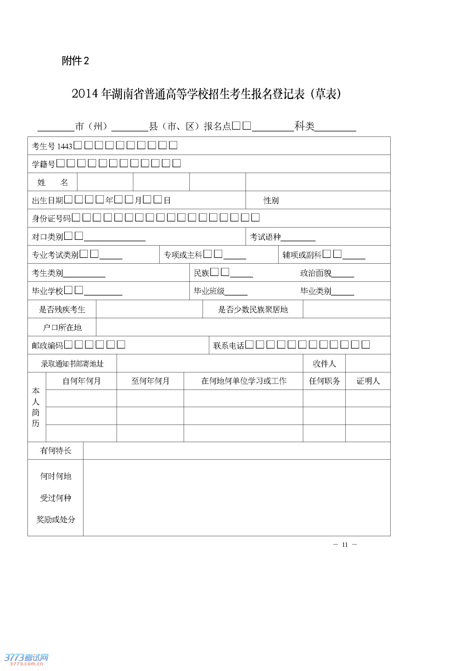 2.2014年湖南省普通高等学校招生考生报名登记表(草表)