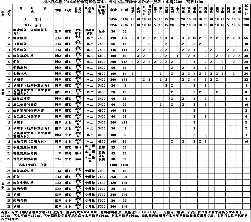 2014年桂林医学院普通高等教育本、专科招生来源计划分配表