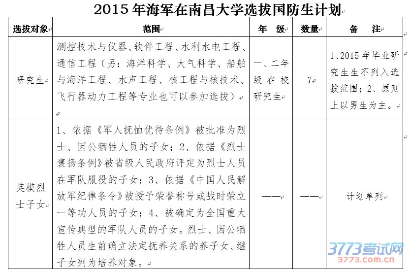 附件:2015年海军在南昌大学选拔国防生计划