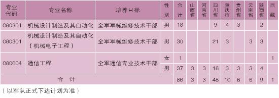 我校今年将继续在四川、重庆、贵州、云南、陕西、山西、河南、西藏等8省市为中国人民解放军招收重点本科(四年制、理科)国防生86名。招生计划如下: