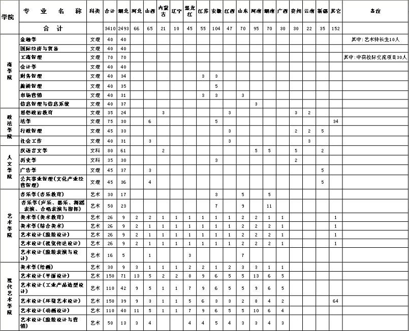 2、湖北计划中,除艺术、体育类专业以及自主招生、双特色生等面向全省(含武汉市)招生外,其它文、理科类专业80%面向武汉市招生,20%面向全省(含武汉市)招生。