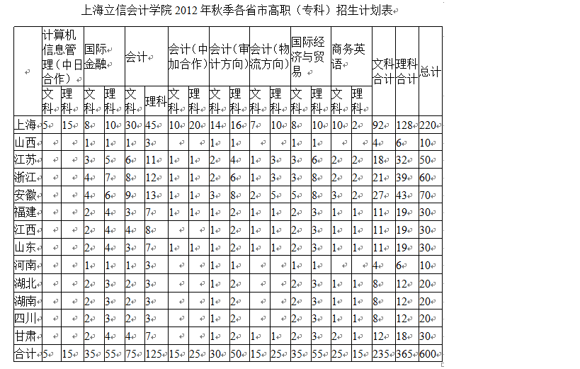 上海立信会计学院2012年秋季各省市高职(专科)招生计划表  上海立信会计学院2012年各省市专科招生计划上海立信会计学院2012年秋季各省市高职(专科)招生计划表