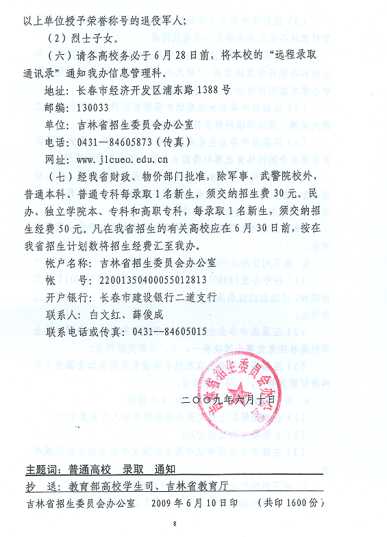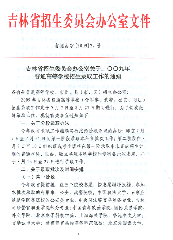 [组图]吉林省招生委员会办公室2009年高考招生录取工作的通知