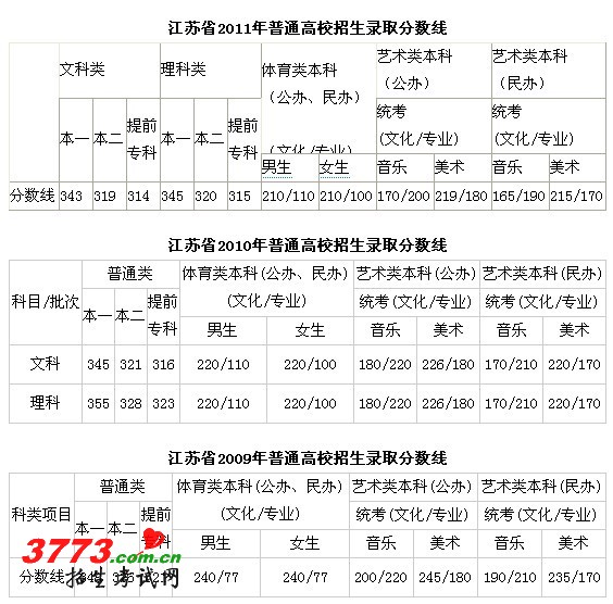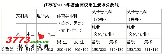 2012年江苏高考本一文科341分,理科340分;本二文科311分,理科312分;体育类本科(公办、民办)男生206/110(文化/专业),女生206/100(文化/专业);艺术类本科(公办)音乐168/200(文化/专业),美术215/180(文化/专业);艺术类本科(民办)音乐163/190(文化/专业),美术211/170(文化/专业)。