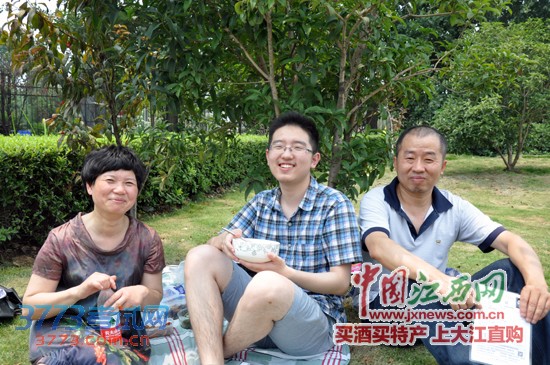在南昌二中考点,两位家长给刚从考场出来的小孩送饭。