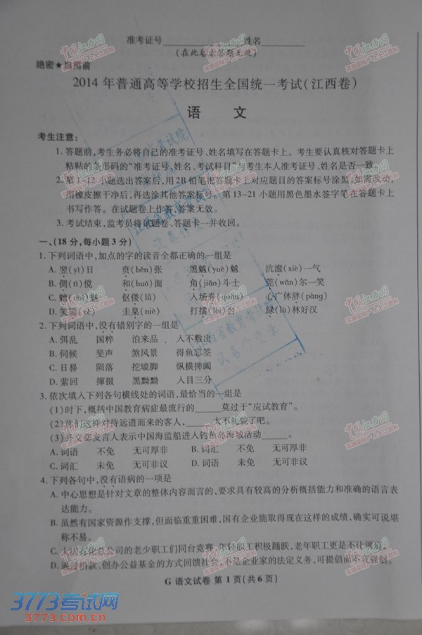 中国江西网讯 记者叶新阔报道:截至6月8日中午,江西2014年高考语文、数学、综合科目考试已结束。中国江西网独家发布本次考试试卷,以下为语文试卷。
