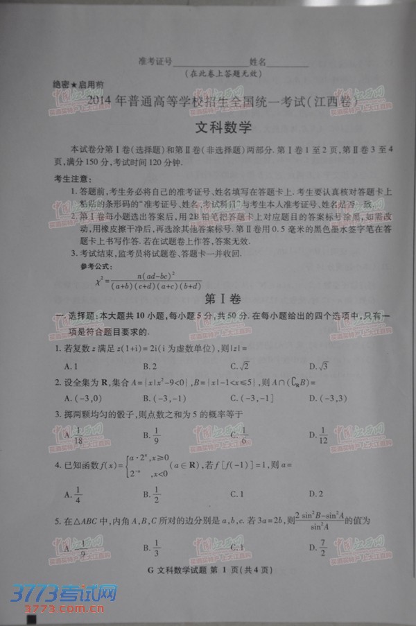 中国江西网讯记者叶新阔报道:截至6月8日中午,江西2014年高考语文、数学、综合科目考试已结束。中国江西网独家发布本次考试试卷,以下为文科数学试卷。
