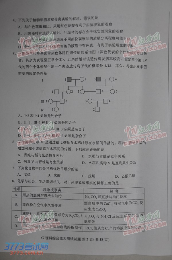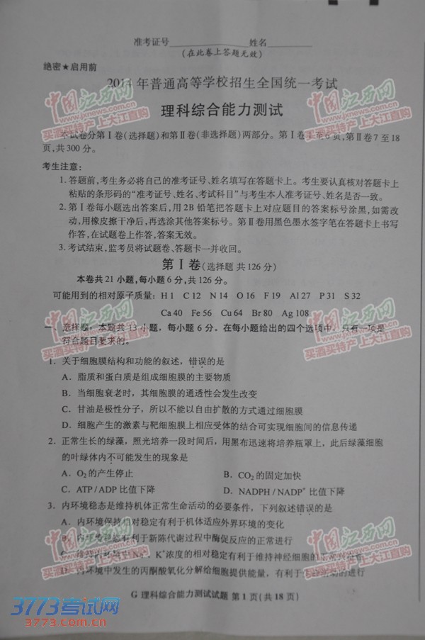 中国江西网讯 记者叶新阔报道:截至6月8日中午,江西2014年高考语文、数学、综合科目考试已结束。中国江西网独家发布本次考试试卷,以下为理科综合试卷,2014江西高考理综试题(理科综合)。