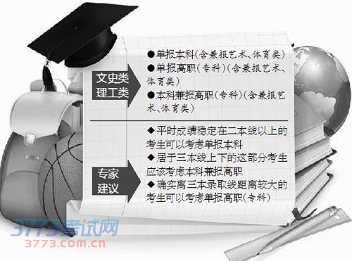 专家建议,考生在高考报名时根据自己平时的成绩稳妥选报,基本上也是分三种情况:一般稳定在二本线以上的考生可以考虑单报本科;居于三本线上下的这部分考生应该考虑本科兼报高职,参加技术科目考试,以免在本科落选后又无法录取理想的专科;确实离三本录取线距离较大的考生则可以考虑单报高职(专科)。