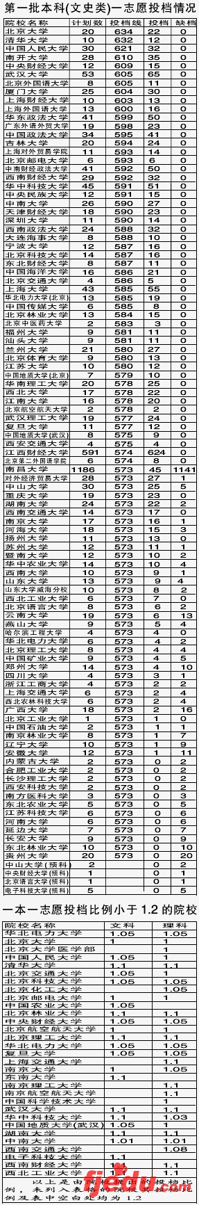 参加本批次文史类录取的院校有97所(不含少数民族预科班),第一志愿投档满额的院校有57所,投档分数在600分以上的院校有10所。其中:北京大学634分,清华大学632分,中国人民大学621分,南开大学610分,中央财经大学609分。