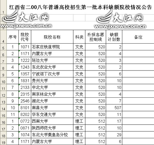 7月13日晚,江西省高招办公布了2008年江西省普通高招第一批本科缺额院校计划表,文理共缺额2729人。其中,文史类缺额院校11所,缺额566人,理工类缺额院校27所,缺额2163人。
