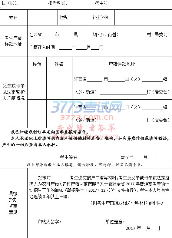 江西省2017年农村订单定向医学生报考资格初审表