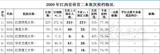 [组图]江西省2009年体育类二本文化315分专业70分以上可补报