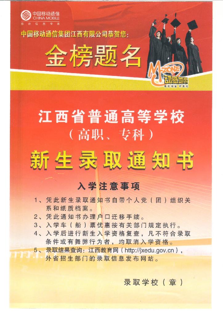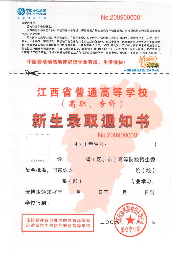 [组图]2009年江西省普通高校(高职、专科)新生录取通知书样式