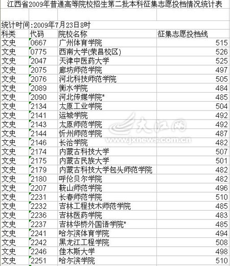 江西省2009年高招文史类二本院校征集志愿投档线(点击查看全部)