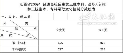 大江网讯 记者肖蓓报道:7月28日晚,江西省高招办公布2009年普通高校招生第三批本科、高职(专科)和三校生本、专科录取文化控制分数线。