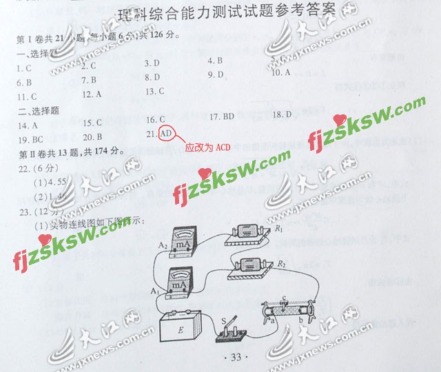 大江网快讯:记者肖蓓报道:6月11日,江西省高招办特发布“2010年高考参考答案(理综)更正说明”,《2010年普通高等学校招生统一考试试题、参考答案》第33页,“理科综合能力测试试题参考答案”第21题由“AD”更改为“ACD”。
