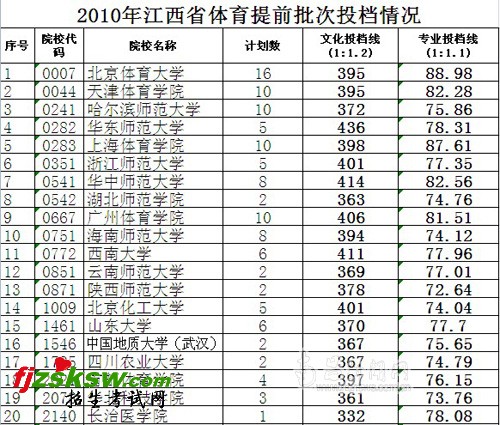 据了解,今年体育类提前本科批次投档一志愿全满。其中文化投档分数上400分以上的有七所,分别是:华东师范大学436分,华中师范大学414分,西南大学411分,广州体育大学406分,浙江师范大学401分,北京化工大学401分,成都中医大学401分。体育专业成绩投档分数上80分以上的有七所,分别是:北京体育大学88.98分,上海体育学院87.61分,华中师范大学82.56分,天津体育学院82.28,武汉体育学院82.08分,广州体育学院81.51,哈尔滨体育学院80.12分。