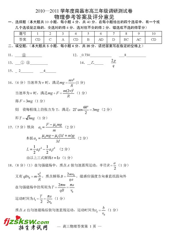 [组图]2011南昌高三调研数学物理试题答案评分标准