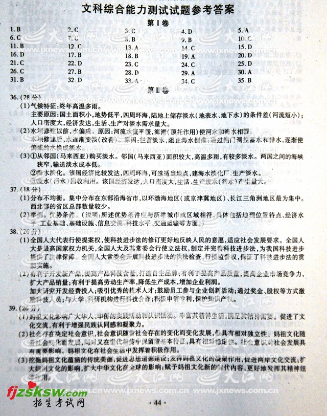 [图文]江西2011年高考文综试题参考答案