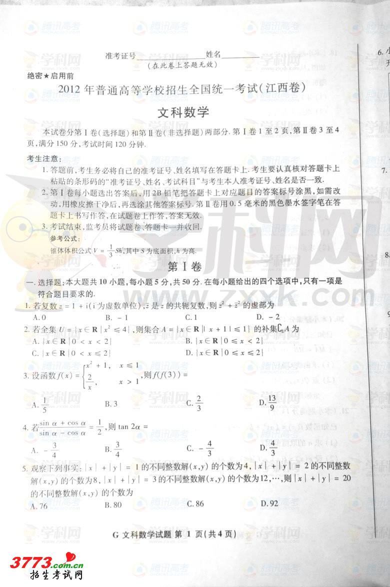 [组图]2012年普通高等学校招生考试江西卷文数试题卷答案