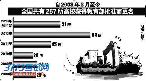 20日,上大学网最新发布的《2008至2013年教育部批准更名的全国高校名单目录》统计显示,自2008年3月至今,全国共有257所高等院校获得教育部批准而顺利更名,占全国目前具有高招资格高校总数的10.35%。