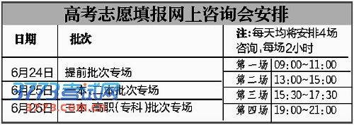 24~26日,省教育厅将连续三天举行高考志愿填报网上咨询会,每天均将安排4场咨询,每场2小时。