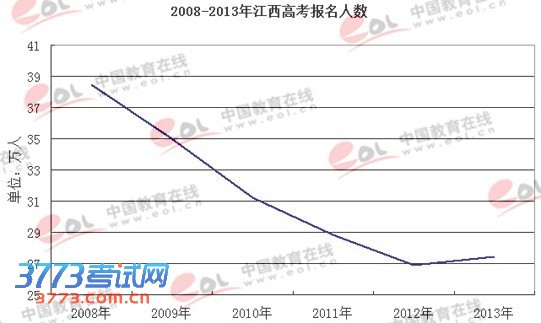 3773考试网江西地区高考志愿填报指南显示:2008年江西高考报名人数38.44万人,创历史新高。之后开始下降。2009年有35万人,2010年有31.2万人,2011年有28.86万人,2012年只有26.9万人报名。